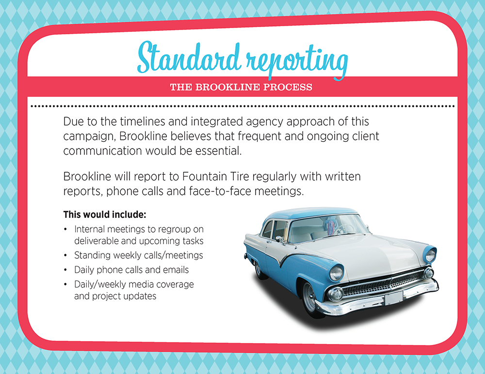 Created a 1950s-themed proposal for a PR company, contributing to their successful bid for Fountain Tire’s 60th anniversary advertising campaign.