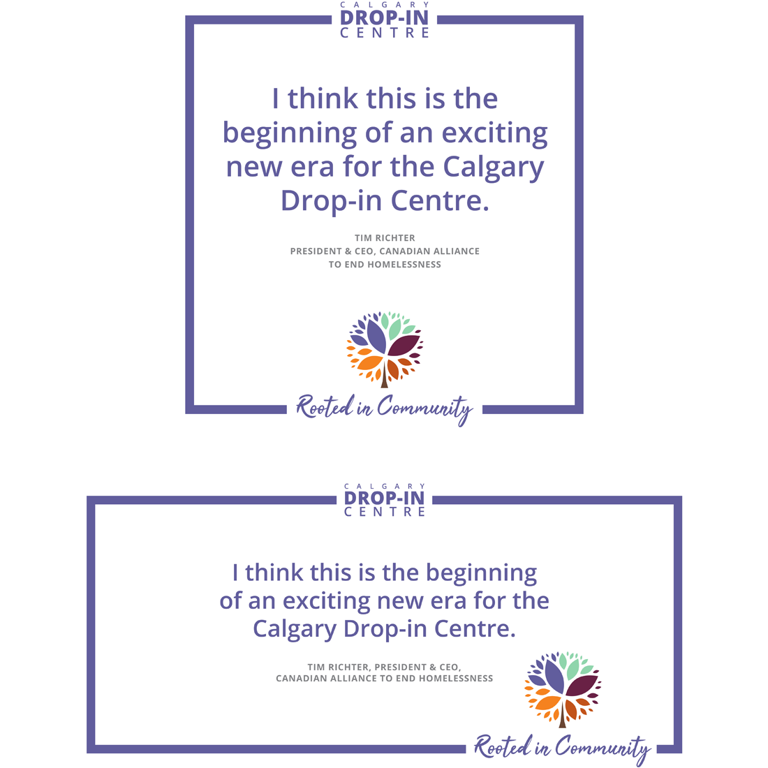 Social media templates incorporating the "Rooted in Community" branding. The Drop-in Centre needed a text based template as they cannot use photography due to privacy and good stock photography representing the homeless population is very limited.